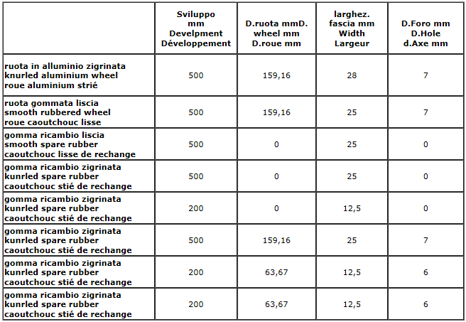 Ricambi per ruote sviluppo 200, liscia o zigrinata.